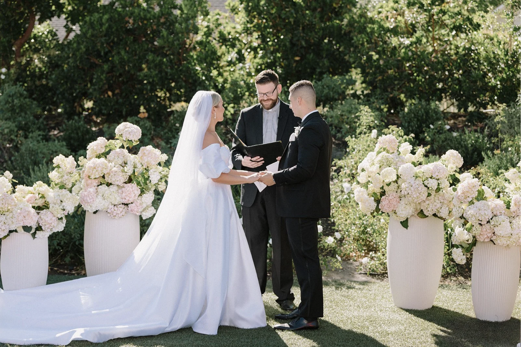 The ceremony lawn sits against a backdrop of rolling vineyards and expansive sky, which naturally lends itself to floral installations that feel sculptural and modern. Instead of overwhelming the landscape, the most successful designs here tend to frame it.